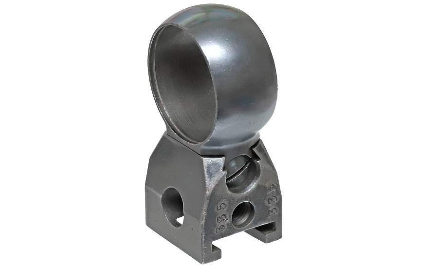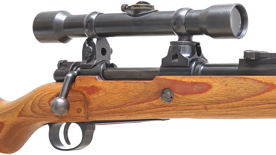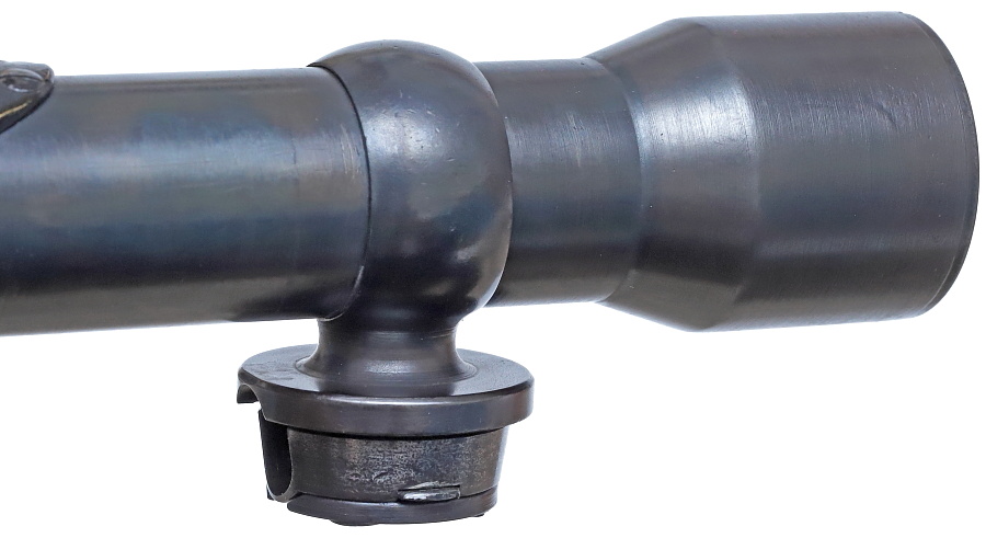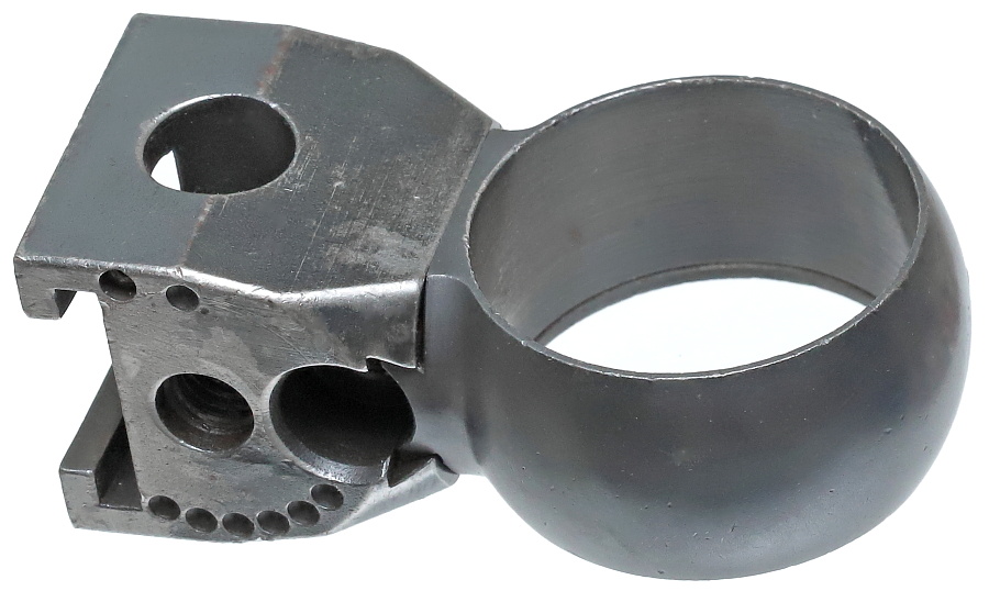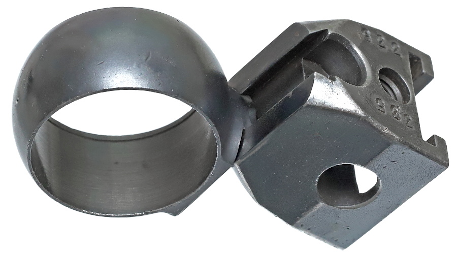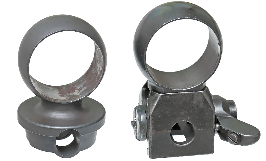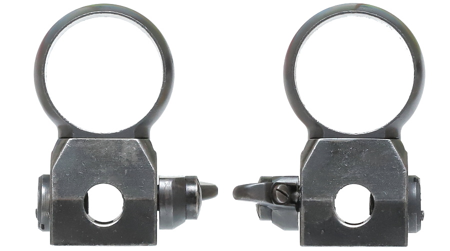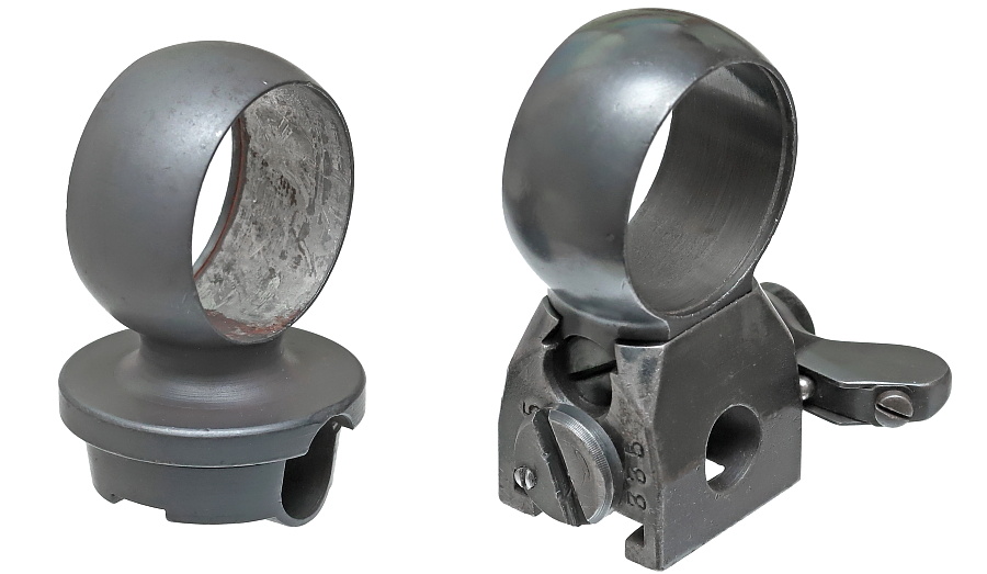 望遠照準器を保持するリング支柱(写真左が前部、右が後部用)。スチール削り出しでガッチリとしており、いかにもドイツらしい造り。リング部は一体型のため望遠照準器を分解しないと取り付けができない。取り付けには望遠照準器の接眼レンズ鏡胴と中央部の調整ダイヤルを基部ごと取り外しリングを通す。これらの作業は生産工場で行われ、リングと望遠照準器はロウ付けで固定されるため分解できない。