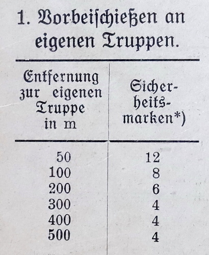 11. 実戦射撃の間に、友軍を越えて射撃するために用いられる一本の銃身からは、およそ1500発以上は発射してはならない。冷却後、銃身は武器係によって、口径ゲージ7.96mmおよび8.0mmで測定されねばならない。 注記: 実戦射撃の前後には、M.G.およびすべての銃身は武器係によって検査されねばならない。超過射撃に不適と判断されたM.G.は修理が行われ再び承認されるまで、超過射撃に使用してはならず、不適合の銃身は「SX-銃身」として扱う。