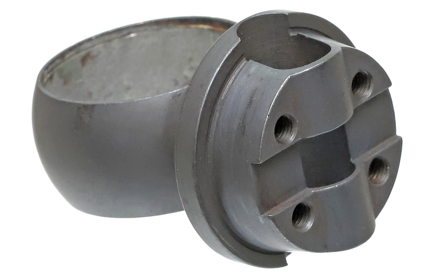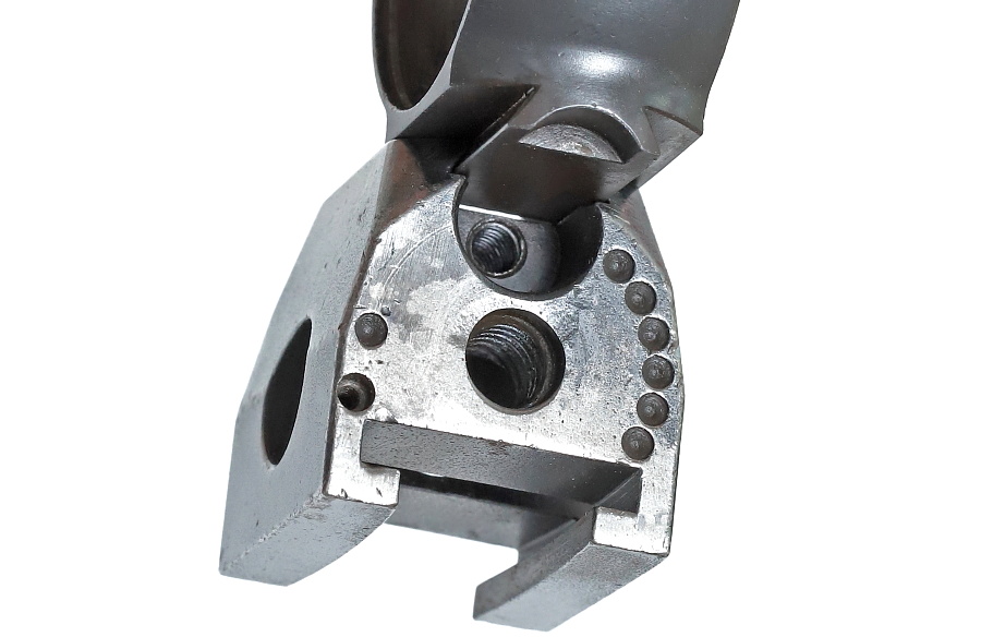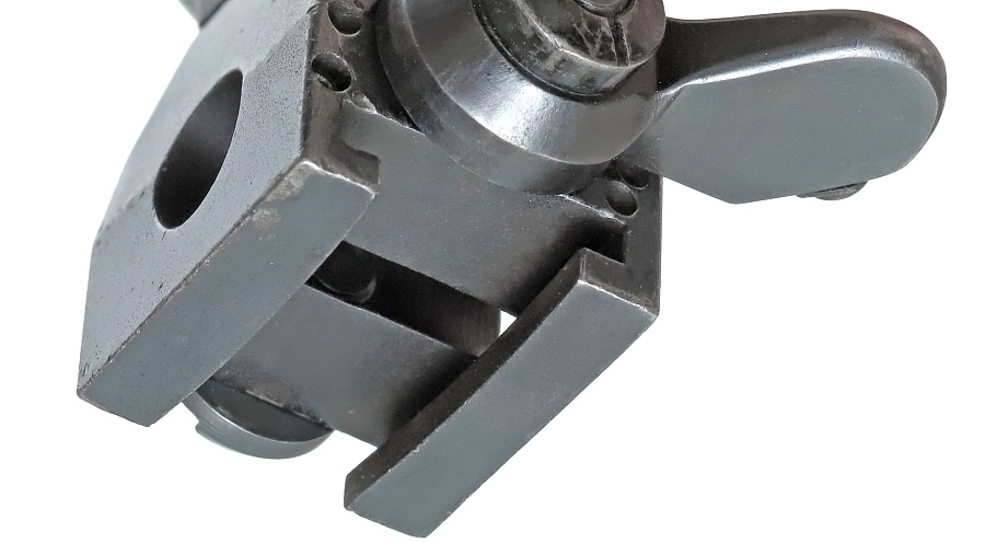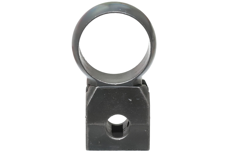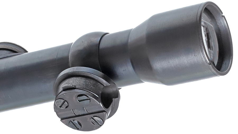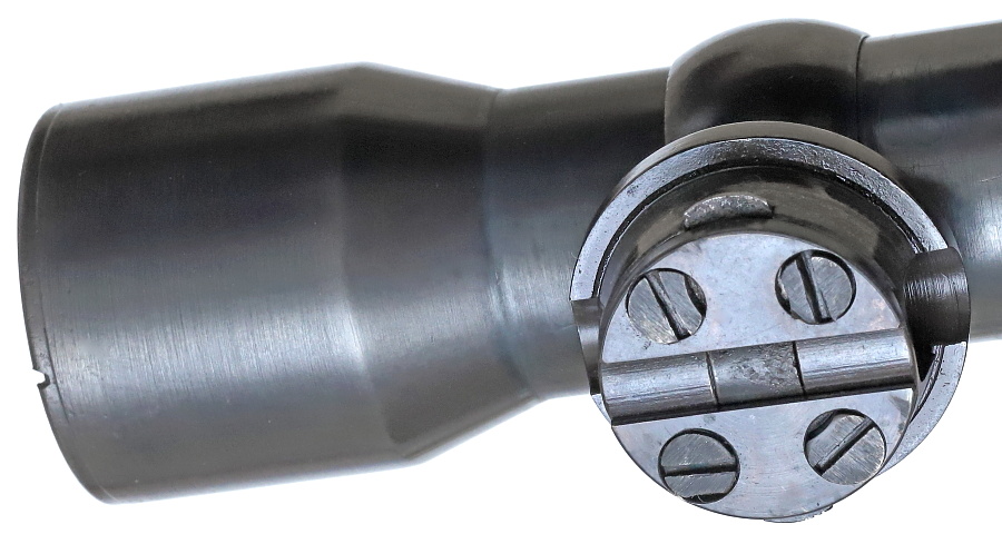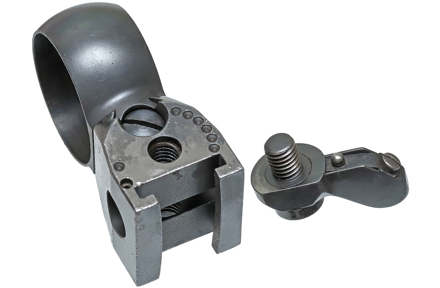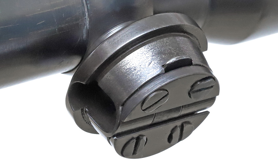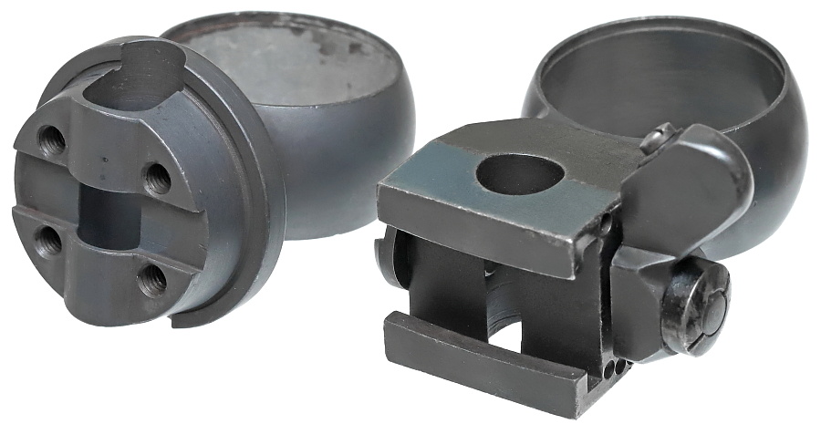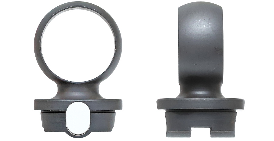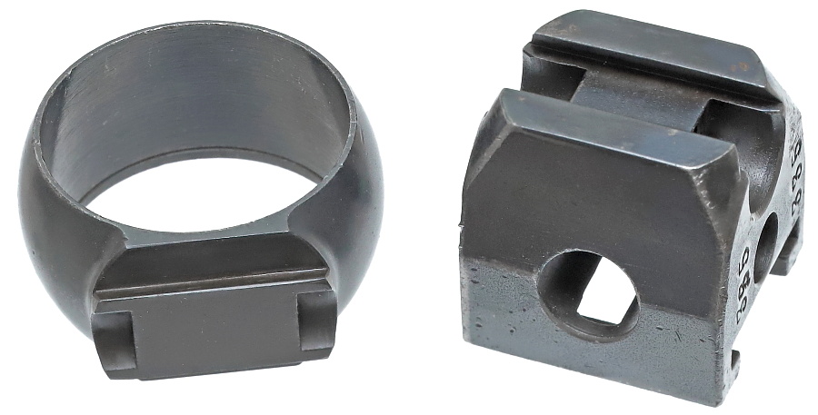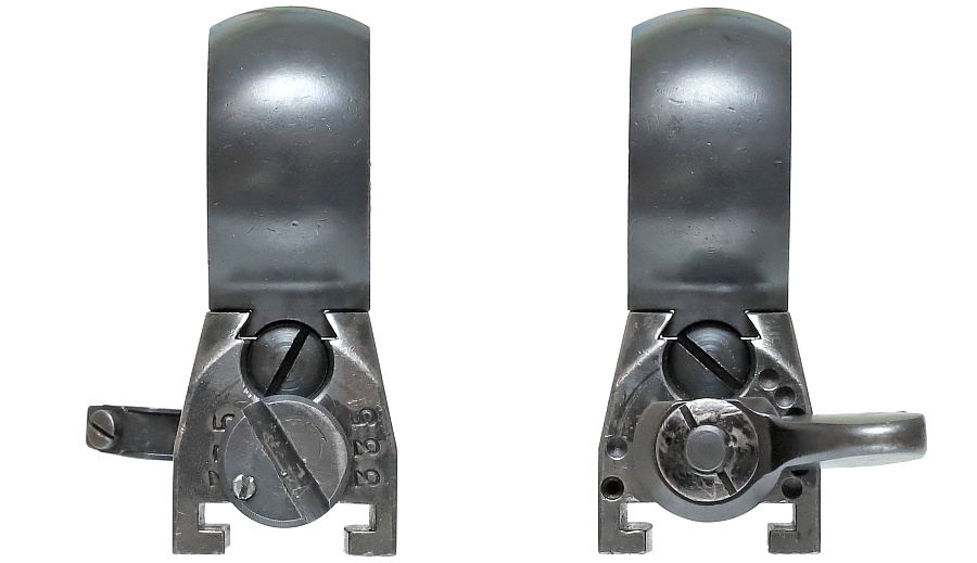 望遠照準器を保持するリング支柱(写真左が前部、右が後部用)。スチール削り出しでガッチリとしており、いかにもドイツらしい造り。リング部は一体型のため望遠照準器を分解しないと取り付けができない。取り付けには望遠照準器の接眼レンズ鏡胴と中央部の調整ダイヤルを基部ごと取り外しリングを通す。これらの作業は生産工場で行われ、リングと望遠照準器はロウ付けで固定されるため分解できない。