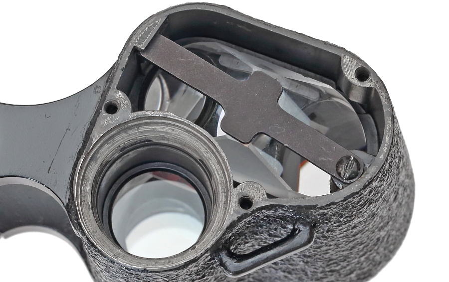 プリズムの固定位置が僅かでもズレると光軸に悪影響を与える。正確な位置に固定できるよう、筐体側のプリズム接地面は一段低く加工されている。