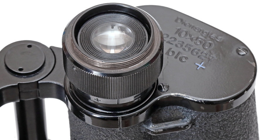 レンズ径50mmの対物レンズ。後期生産型の一部にはレンズコーティングが施されたようだが、本個体はプリズムを含めコーティング無し。Dienstglas 6×30同様に偏芯リングの回転によって光軸を調整できる。