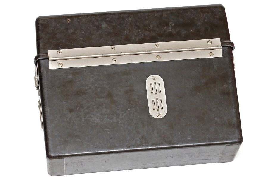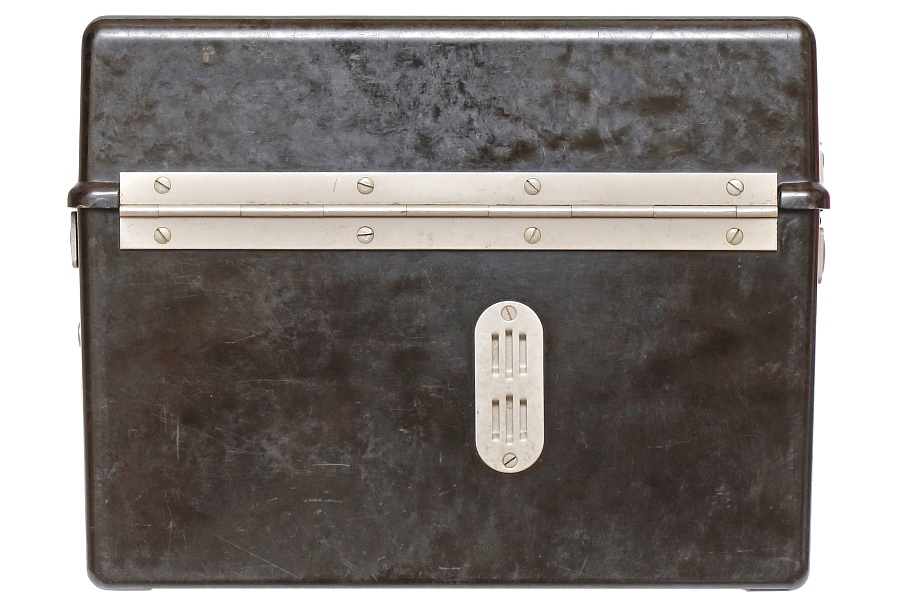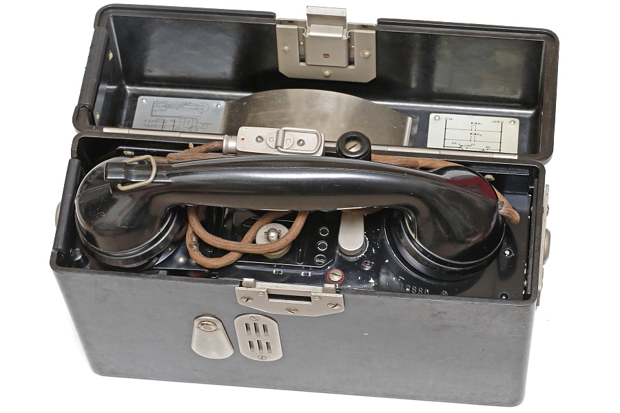 電話機本体を砂や泥、水、衝撃などから保護するためベークライト製ケースに収納したFF33。外観はシンプルで洗練されている。FF33以前のドイツ軍野戦電話は木製のケースだったが、樹脂製に切り替えたことで生産性と防水性が大きく向上し、軽量化にもつながった(FF26は6.4㎏)。