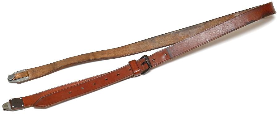 オリジナルの革製スリング。全長108cmのスリングと長さ調整用の金具がついた29.5cmの短いスリングがつながっている。長さは20cmの範囲・9段階で調整可。