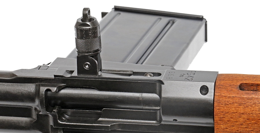 ドイツ軍小火器では珍しい回転ドラム式のリアサイト。前方に折り畳むことができる。射撃距離の調整幅は100mから最大1200mまで。調整はサイトブレードを上から押して、ドラムを回転させる。