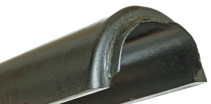 初期は削り出しであったが、中期以降はプレス製で作られた2つのバンド金具。写真右のバンド部品はプレスでスリング通し部を加工した後、楕円形状に丸めて接合部を溶接しているようだが、その溶接跡が全く目立たぬよう研磨され平滑に仕上げる手の込んだ作り。