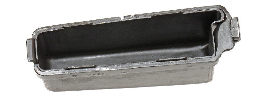 プレス加工された弾倉。後面に設けられたリブのような突起はフォロアーがスムーズに動くためのガイドが収まる。