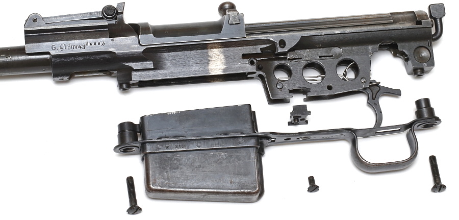 木製ストックを外した状態のレシーバー部(※引き金機構の部品などが除去されている)。撃鉄を内蔵した撃発機構は、ストライカー方式を採用したG.41(M)よりも雷管の撃発が確実に行えるという利点を持っていた。