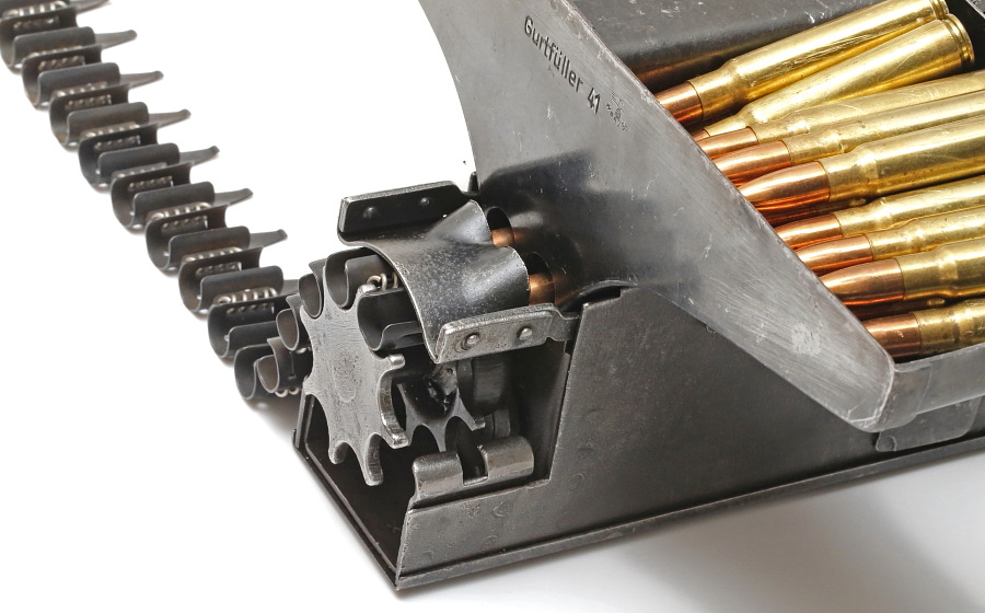 実際の作動状況。レバーの押し下げによってホッパー最下部の弾薬が押し出され、ベルトリンクに装着される。レバーを押す動作はゆっくりやると作動不良を起こすため、「ガチャン!」と勢い良く押し込む必要がある。