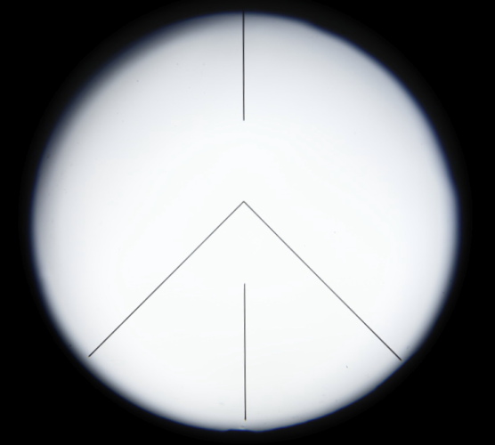 調整ダイヤルと対物レンズの角度指標ともに「0」を示している状態。