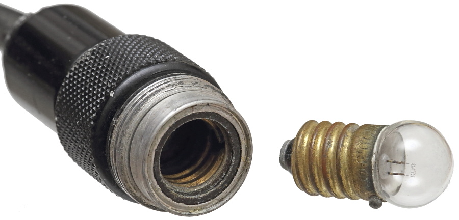 ローレット加工された部分を回すと先端部が外れ、中の電球を交換できる。