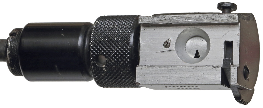 主要パーツはアルミ製。縦長のスリットから上部へ突き出た丸い突起は光量調節のつまみ。反対側のギザギザの滑り止めが刻まれた金属板は照準器側の溝に嵌合し照明装置を固定する金具。