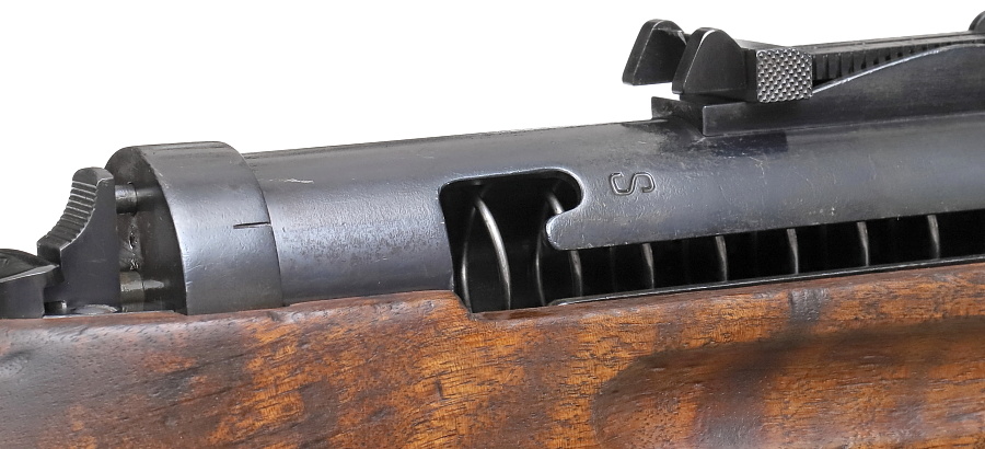 「S」の刻印があるスリットにボルトハンドルを引っ掛けると安全な状態になる。MP28唯一の安全装置。この場合、空いたエジェクションポートから砂や泥などの異物が入りやすく、作動不良を引き起こす可能性が高まる。