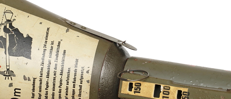 全体がフィールドグレーに近いグリーンで塗装されたパンツァーファウスト100。弾頭内部の炸薬や発射薬は完全に除去された安全品であるが、各部はオリジナルの形状を保っている。現存する他のパンツァーファウストを見る限り、各所に製造メーカーや製造年を示すスタンプ?が押されているようであるが、この個体は確認できず製造年は不明。配備時期を考えると恐らくは末期の45年製と思われる。