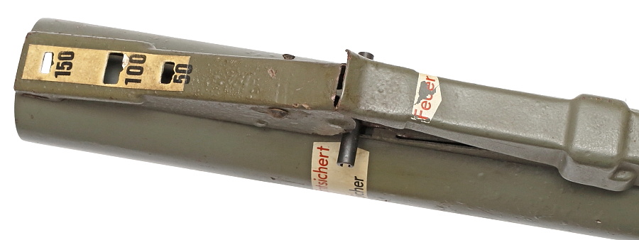 50、100、150メートルの射撃距離に応じて3つのサイト穴が並んだリアサイト。最大150メートルまでの照準が可能となっているが「パンツァーファウスト100」の名称が示す通り有効射程は約100メートル。