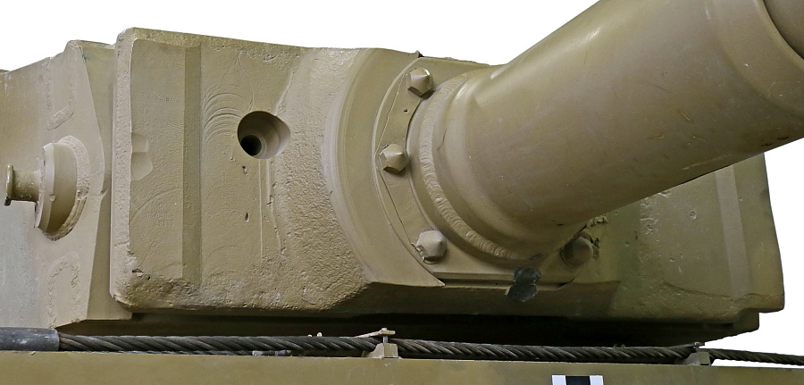装甲厚100㎜の前面装甲板に取り付けられたタイガーⅠ戦車のKugelblende 80。銃身の右に見える小さな穴は照準器の視野を確保するための開口部。円形マウントの左右にある蝶ネジはマウントカバー固定用。