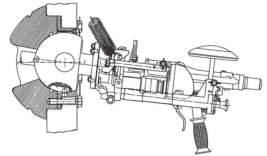新型ボールマウントの左側面図。マウント操作時に握る下方に突き出たグリップとその前方の細長い突起が引き金。マウントは後部が重くそのままでは運用に支障をきたすため、以下の対策が取られている。