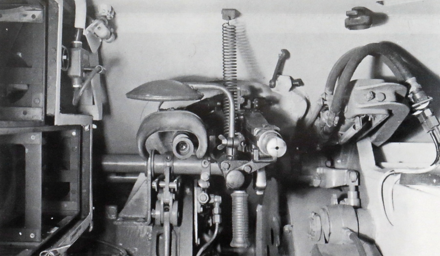 パンサー戦車に装備されたボールマウント。右目に配置された単眼の光学照準器に額パッド、後部バランスを取る頭部パッドとコイルスプリングなどが明瞭に写っている。