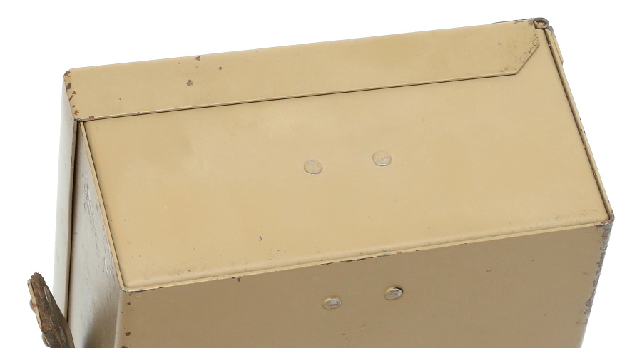 理由は不明だが他の現存品を見る限り、本個体の「MG.- Zubehör」の文字は上下が逆さになっている。写真のように革ベルトが付いた面が箱の「上」になるようだ。