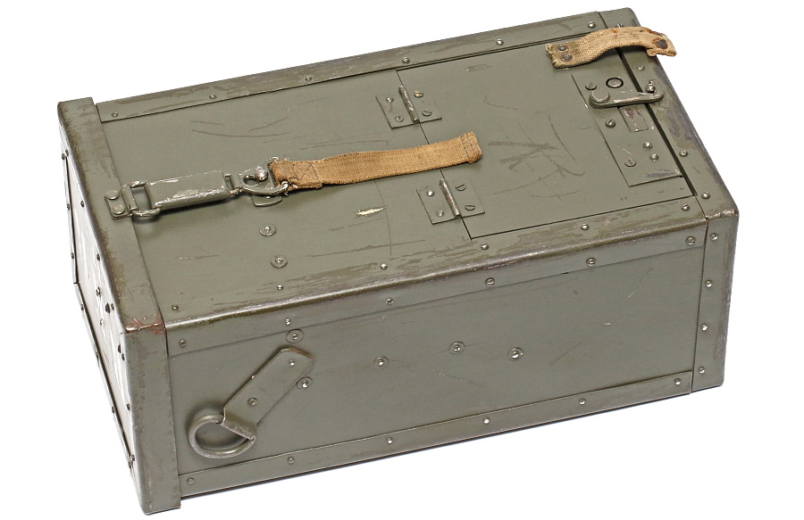 箱はスチール製の枠部品に木製板を取り付けた構造で強固。箱内部は中央が仕切られており、上下の空間に分かれる。本品には欠損しているが、左右のD環にはスリングが装着されると思われる。箱はRk31と同色のフィールドグレイで塗装され、上面には「R.KR 31」のステンシル文字が白で書かれている。