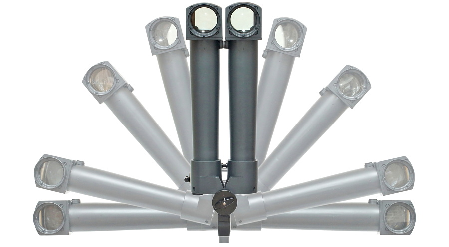 左右対物レンズの角度調整機能が砲隊鏡最大の特徴。ペリスコープ基部の回転は左右共に180度の可動範囲となっており、通常は縦から横位置までの90度の範囲内で使用する。基本は写真のように左右を同じ角度ずつ動かして使う。