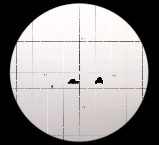 SF14Zのレティクルは用途に合わせた様々なバリエーションがあり、右側の接眼レンズのみに配置され左側は何もない。当然のことながらペリスコープ部が動いてもレティクルは回転せず、同じ位置を保つ機構を持っている。