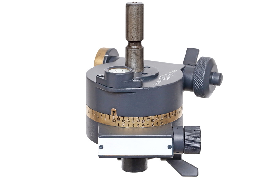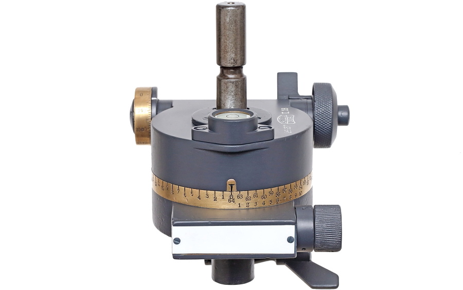 SF14Zと光学機器用3脚の間に装備する角度計測盤。ダイヤル操作による左右への回転と1ミル単位での左右角度計測を可能にする。掲載にあたりレストアと再塗装を行っている。