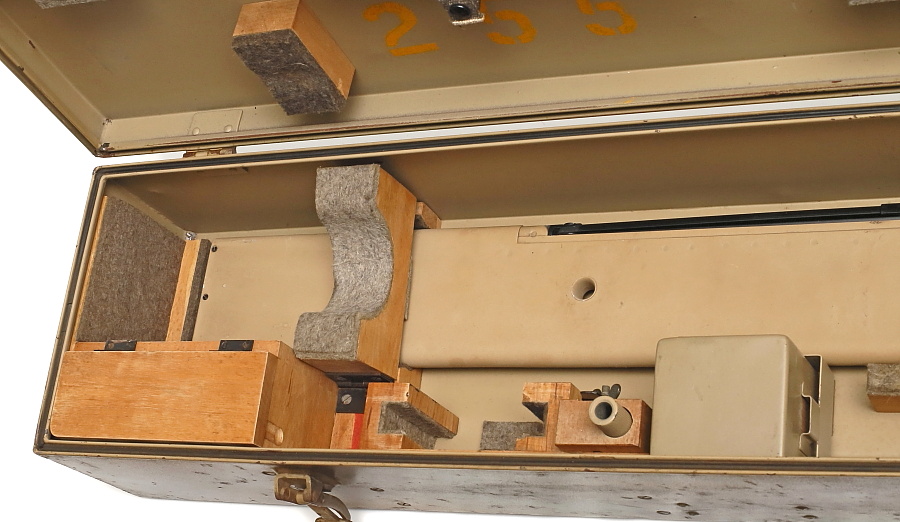 1メートル測距儀本体は左右2箇所の仕切り板で固定される。収納品と接する部分にはすべてフェルトが貼られており、傷付きを防止する。