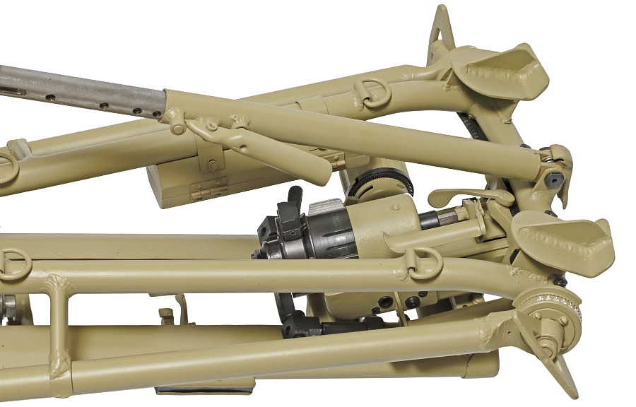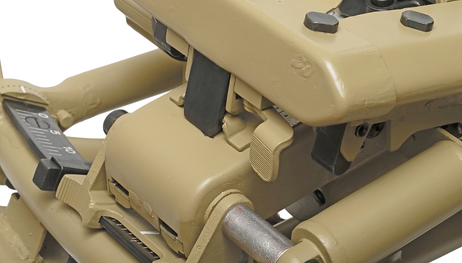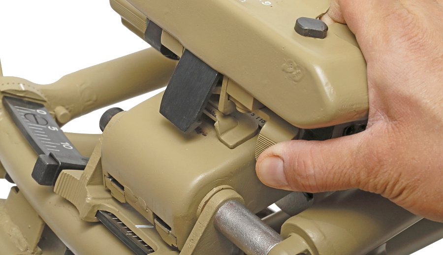 折りたたまれたラフェッテはマウント後部に設けられた爪が射角調整装置の射表下にある突起と勘合することでロックされ、親指で押しているレバーによってロックを解除する。