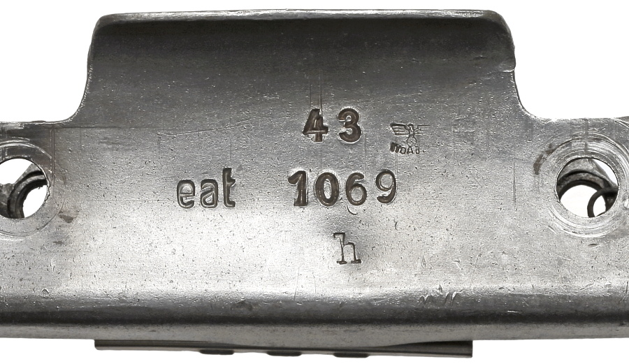 マウントの後部カバー上面。1943年製を示す「43」と「1069」の製造番号、メーカーコード「eat」は Rudolf Schluckebier & Co,Eisenbahnbedarf を示す。バッフェンアムトは不鮮明で数字が読めず、「h」の刻印が示す意味も不明。