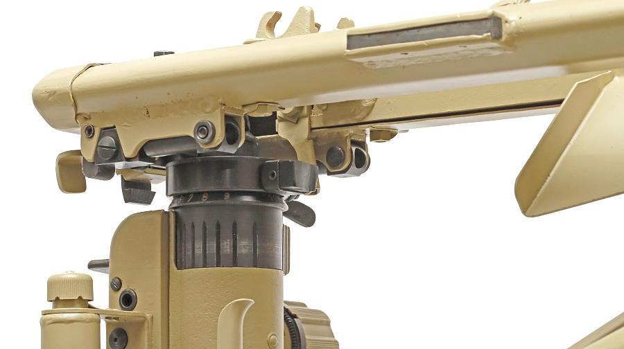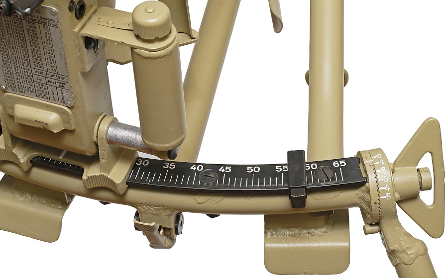 塗装色が異なる以外、ラフェッテ34と全く同じ形状の射角調整装置の周辺。ラフェッテ42は当初、ジャーマングレイ単色で生産が開始され、1943年2月以降は他の装備品と同様にダークイエロー単色となった。主要外装以外のスチール製部品は黒染め仕上げで無塗装、リコイルダンパーや光学照準器マウントなどのアルミ部品も無塗装だが緑色のアルマイト処理?が施されている個体も確認できる。
