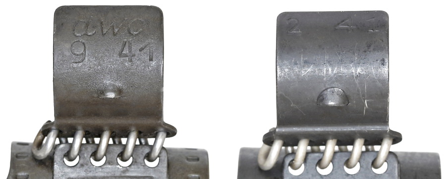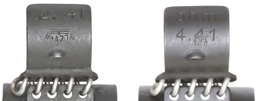 50連リンク端の四角いタブには製造メーカーコード、生産月、バッフェンアムト刻印などが入るが、メーカーごとに内容はバラバラ、刻印の上下向きも決まりがないようだ。