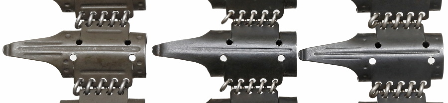 1934年から1936年までに生産された初期型のベルトリンクは15%のクロムを含有するステンレス鋼で生産されており、灰色の外観が特徴。錆に強く繰り返しの使用にも耐える耐久性を持っていたが、一方でその材料特性から破損する事例もあったようだ。その後は炭素鋼のプレス製となり、ブルーイング(黒染め)かパーカーライジング仕上げとなった。Gurt34は1941年8月まで生産が続き、これ以降はリブ付きの改良型に置き換わる。
