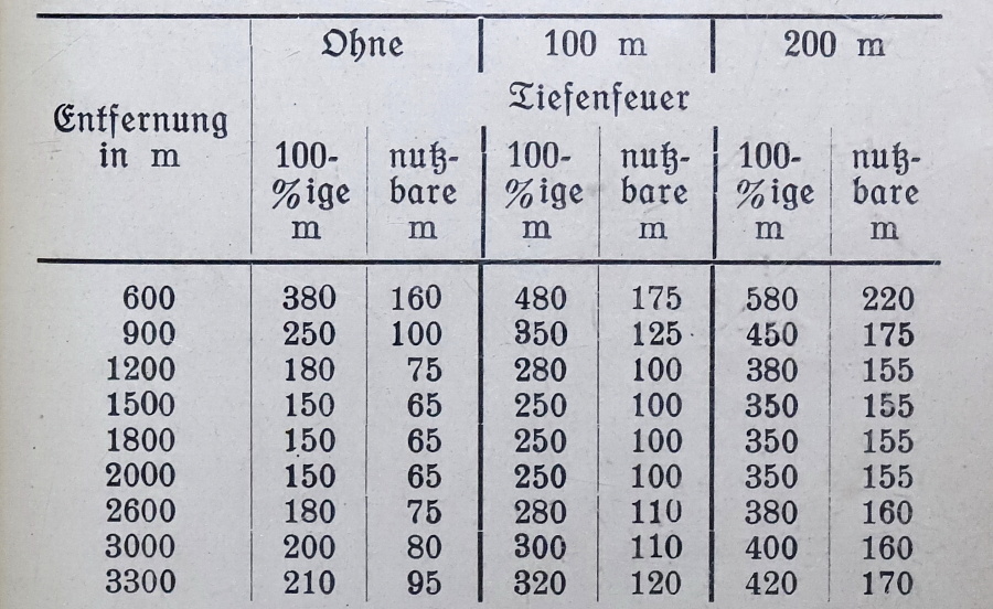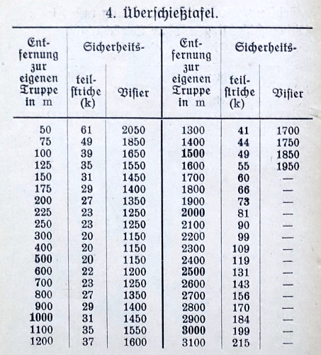 11. 実戦射撃の間に、友軍を越えて射撃するために用いられる一本の銃身からは、およそ1500発以上は発射してはならない。冷却後、銃身は武器係によって、口径ゲージ7.96mmおよび8.0mmで測定されねばならない。 注記: 実戦射撃の前後には、M.G.およびすべての銃身は武器係によって検査されねばならない。超過射撃に不適と判断されたM.G.は修理が行われ再び承認されるまで、超過射撃に使用してはならず、不適合の銃身は「SX-銃身」として扱う。