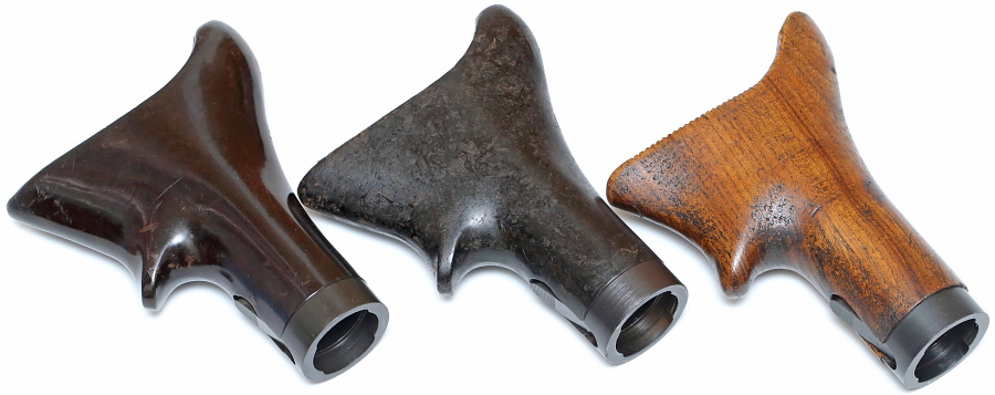 ストックの材質は木製とベークライトの2種類。ベークライト製ストックには肩当て部の上下に破損防止用の金属カバーが付いていたが初期型以降に廃止された。