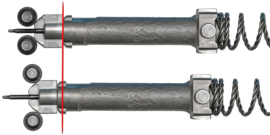 ボルトキャッチ(写真右の部品)は強力なスプリングによってロッキングピースを前に押し出す役割を果たす。第二次大戦中のドイツ軍では使用されず、戦後になって採用された部品。エジェクターロッドの中に配置しボルトキャリアの中に収める。MG42のボルトキャリアは無改造で使える。