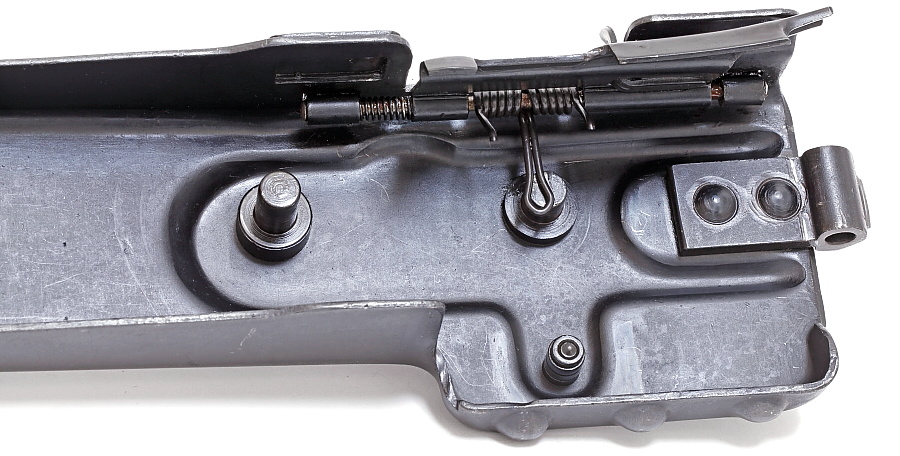 弾帯を受けるプレス製のフィードトレイ。50連ドラムマガジンはフィードトレイ左から延びる2本の爪に取り付ける。