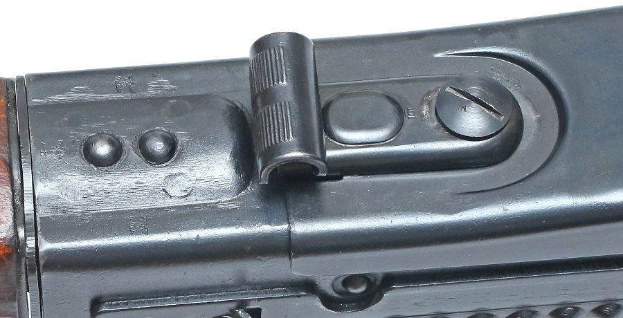 フィードカバーの取り外し方法。フィードカバーとフィードトレイを銃に対して90度上に開けた状態にすると固定ピンを外す事ができる。なおこの固定ピンの頭には「BK」の刻印が打たれているが、これは独軍オリジナル部品ではなく戦後のユーゴスラビアで生産されたM53の部品。分解時に紛失したため交換されたのかもしれない。