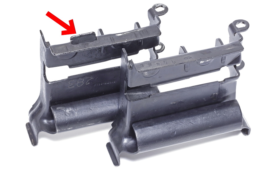 2つのフィードトレイを並べた写真。MG42のフィードトレイは2種類が存在(MG34も同様)する。違いは赤矢印で示した右側に設けられた突起の有無。