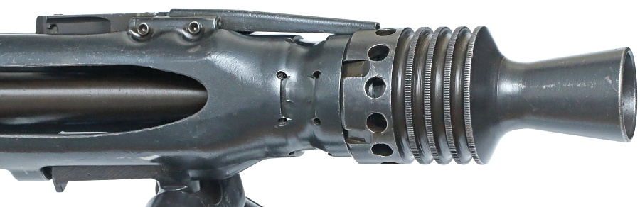 ラッパ型の消炎器内部にリコイルブースターが収まった銃口の基本構造はMG34と同じ。消炎器外周の穴はリコイルブースター内のガスを外へ逃がすためのもの。