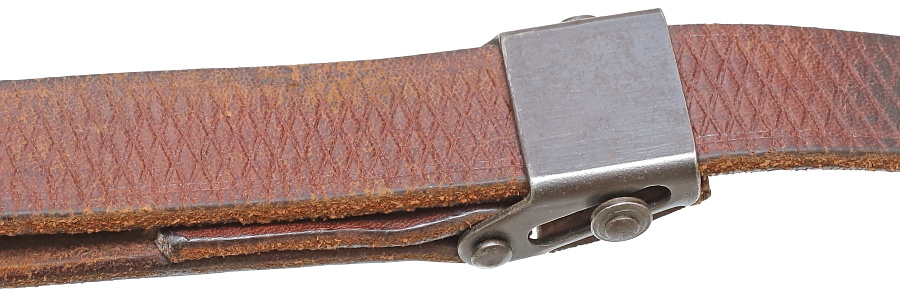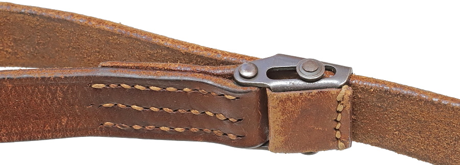 98k用と全く同じスリング長さ調整用の金具。装着時に金具が当たって銃本体に傷が付くことを防止するため、金具の片面にだけ保護用の革が貼られている。金具の製造メーカー刻印は貼られた革の下にある場合が多い。