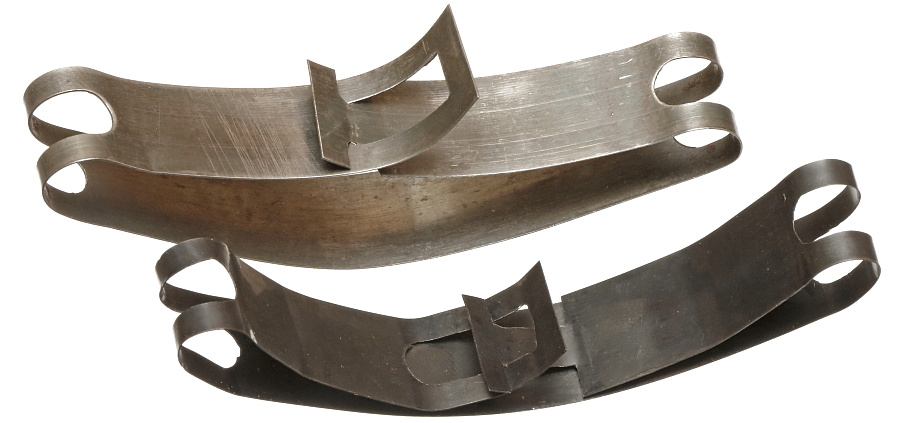 2つの固定バンドは上がオリジナル、下がリプロ品。端のカット形状が異なるほかに板厚もオリジナル0.4㎜、リプロ0.2㎜と大きく違う。